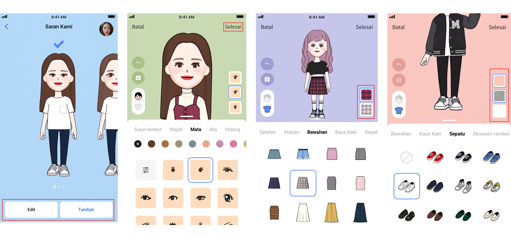3. Avatar akan memberikan beberapa pilihan. Pilih salah satu dan tekan “Tambah” untuk menyimpan dan tekan “Edit” guna mengubah wajah dan pakaian sesuai preferensi kamu. Setelah selesai, pilih “Selesai”. Selain itu, sejumlah bagian wajah dan pakaian bisa diubah sesuai dengan selera pengguna melalui tombol yang terletak di bagian samping kanan.