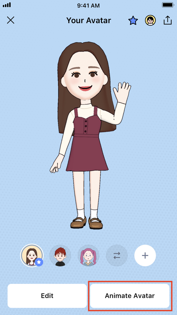 ⑥ Ketuk "edit" untuk kembali ke halaman edit, dan ketuk “Animate Avatar” untuk menambahkan gerakan dan mengubah latar belakang.