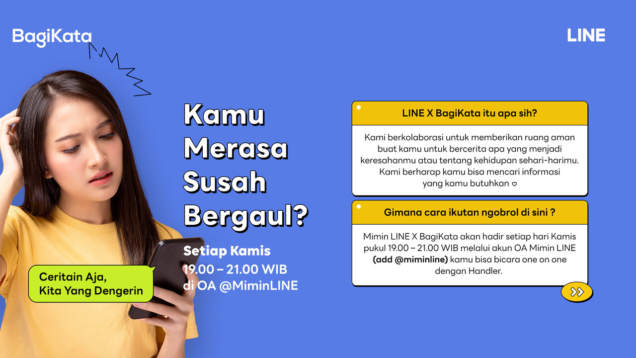 “Kami di BagiKata selalu berkomitmen untuk membantu teman-teman yang tidak tahu untuk bercerita kemana, selalu ada wadah yang dapat menampung cerita mereka. Dengan handlers yang dilatih oleh psikolog klinis langsung, BagiKata bertujuan untuk memperluas kesadaran mengenai pentingnya menjaga kesehatan mental dalam keseharian kita melalui kerjasama dengan LINE ini,” jelas Satriya Adhiguna, Head of Marketing & Partnership, BagiKata.
