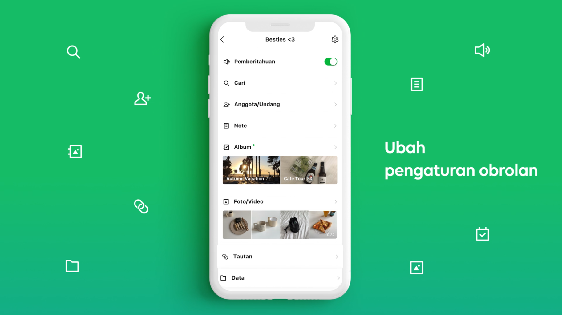 - Ikon Gear - yang berisi pengaturan obrolan di mana pengguna bisa mengaktifkan atau menonaktifkan Pemberitahuan Note, Desain Latar, Kirim Riwayat Obrolan